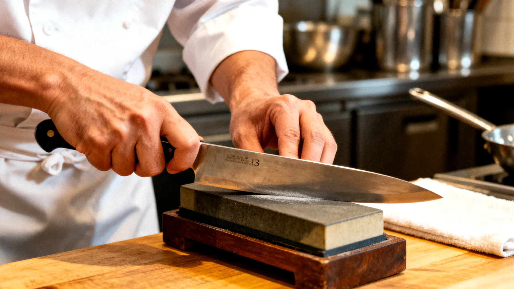 Diese Technik des Abziehens wird in der professionellen Küche als tägliches Ritual praktiziert. Vor jedem Dienst, manchmal mehrmals während einer Schicht, greifen Köche zum Wetzstahl. Die Bewegung ist fließend, fast meditativ – eine kurze Pause, die der Klinge ihre geometrische Integrität zurückgibt. Was von außen wie eine theatralische Geste aussieht, ist pure Funktionalität.